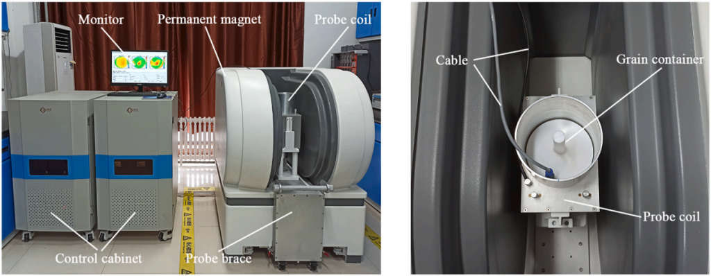 LF-NMR 成像分析仪:开云手机入口,型号:MesoMR12-060H-I,由永磁体(场强0.35T)、探头线圈、探头支架、两个控制柜和显示器组成。探头线圈是数据采集的关键部件,直径150mm,穿透深度120mm,可通过调整成像参数测量置于线圈内谷物样品不同横截面的质子密度数据。
