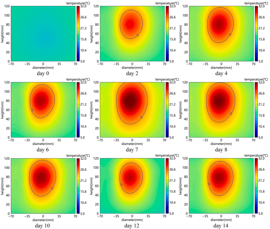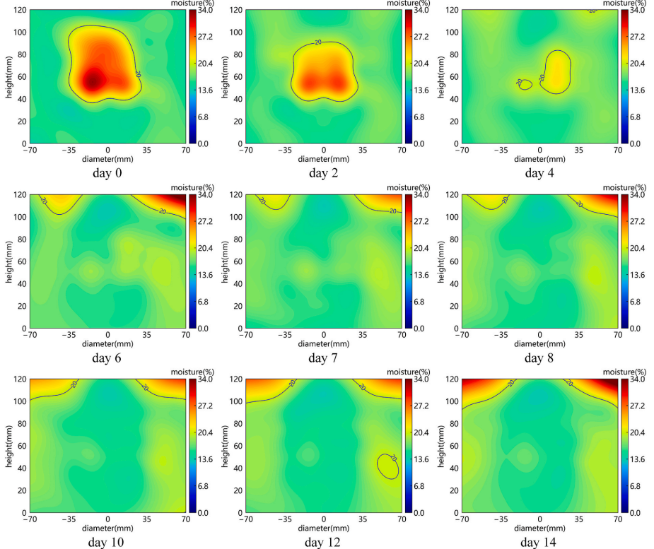 图3显示初始温度几乎均匀分布,约为16℃。随后,由于恒温加热器的加热,中心温度开始升高,第1天中心温度达到28.8℃,内壁附近为15.6℃。在温度梯度的驱动下,热量向外扩散,在样品上部形成局部高温区域。储存初期,该区域的大小和中心温度随时间逐渐增加,第0天至第7天,面积从0cm² 扩展到50.96cm²,中心温度从16.8℃升至32.7℃;后期面积和中心温度随时间下降,第14天分别降至33.42cm² 和30.2℃。这可能是因为初始阶段水稻的高水分赋予其良好的热特性(比热容和热导率),增强了储热和传热能力,导致热量积累和高温区域扩张,而随着水稻逐渐干燥失水,情况逆转,此外,谷物容器内的微气流通过传热也有助于减小高温区域。