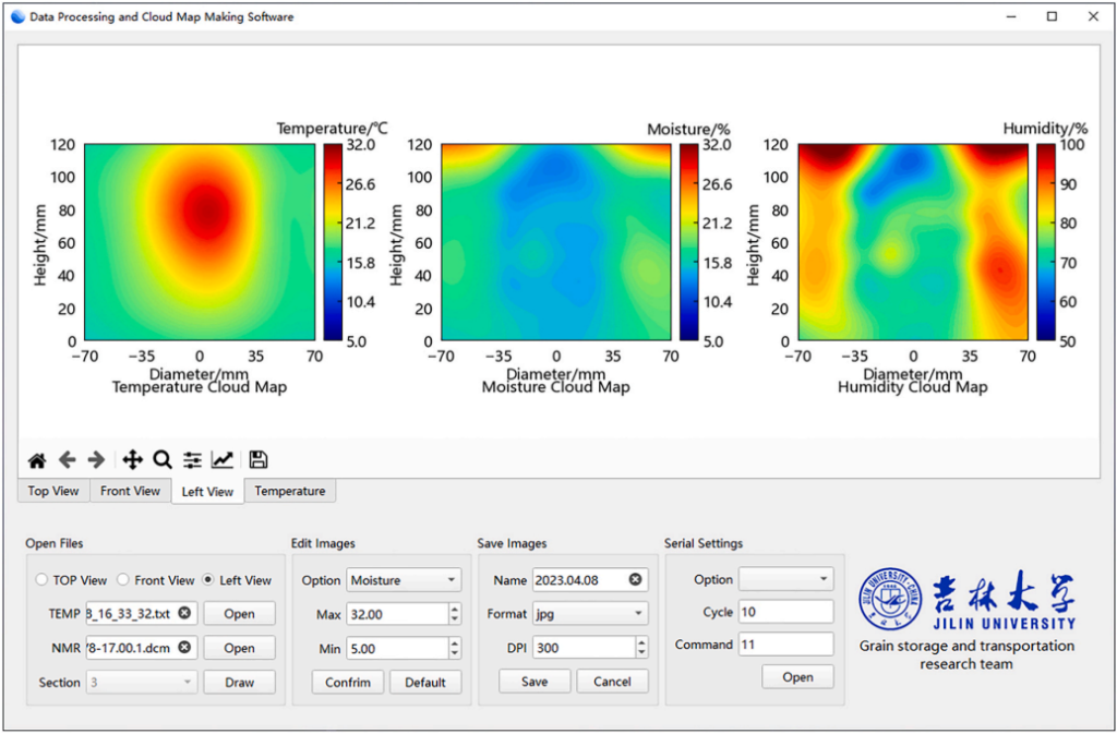 数据采集与图像生成软件:使用 Python(3.9.12 版)开发了数据采集与图像创建软件,用于处理测量数据并将结果可视化为云图。软件界面在功能上分为显示区域和参数设置区域,显示区域可同时显示谷物样品一个横截面的顶部、正面或左侧视图的温度、水分和湿度云图,也可以表格形式显示原始温度数据。