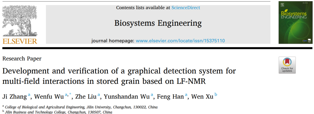 [1] Zhang J, Wu W, Liu Z, et al. Development and verification of a graphical detection system for multi-field interactions in stored grain based on LF-NMR[J].Biosystems Engineering, 2024:241.