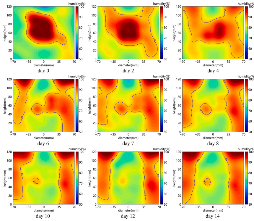 本研究提出了首个基于低场核磁共振(LF-NMR)的图形检测系统,用于探究储粮中的多场相互作用。从图3、图4和图5的云图中可以直接观察到温度、水分和湿度场之间的物理相互作用。简而言之,在相互作用过程中,温度充当驱动力,促使水分蒸发并引发微气流;微气流作为载体,协助水蒸气扩散和水分迁移,进而影响温度分布。对于谷物发芽而言,温度需高于4℃且含水率在15%至45%之间。同样,真菌生长需要温度高于20℃、含水率高于13.5%(湿基)且相对湿度高于75%。通过分析云图发现,尽管整个储存期间中心区域的温度始终超过25℃,但中心区域的含水率和相对湿度却随时间下降。相反,左上和右上截面的含水率和相对湿度持续增加,且温度维持在20℃左右。因此,尽管温度较低,但与中心区域相比,这些区域的条件更有利于真菌生长和谷物发芽。